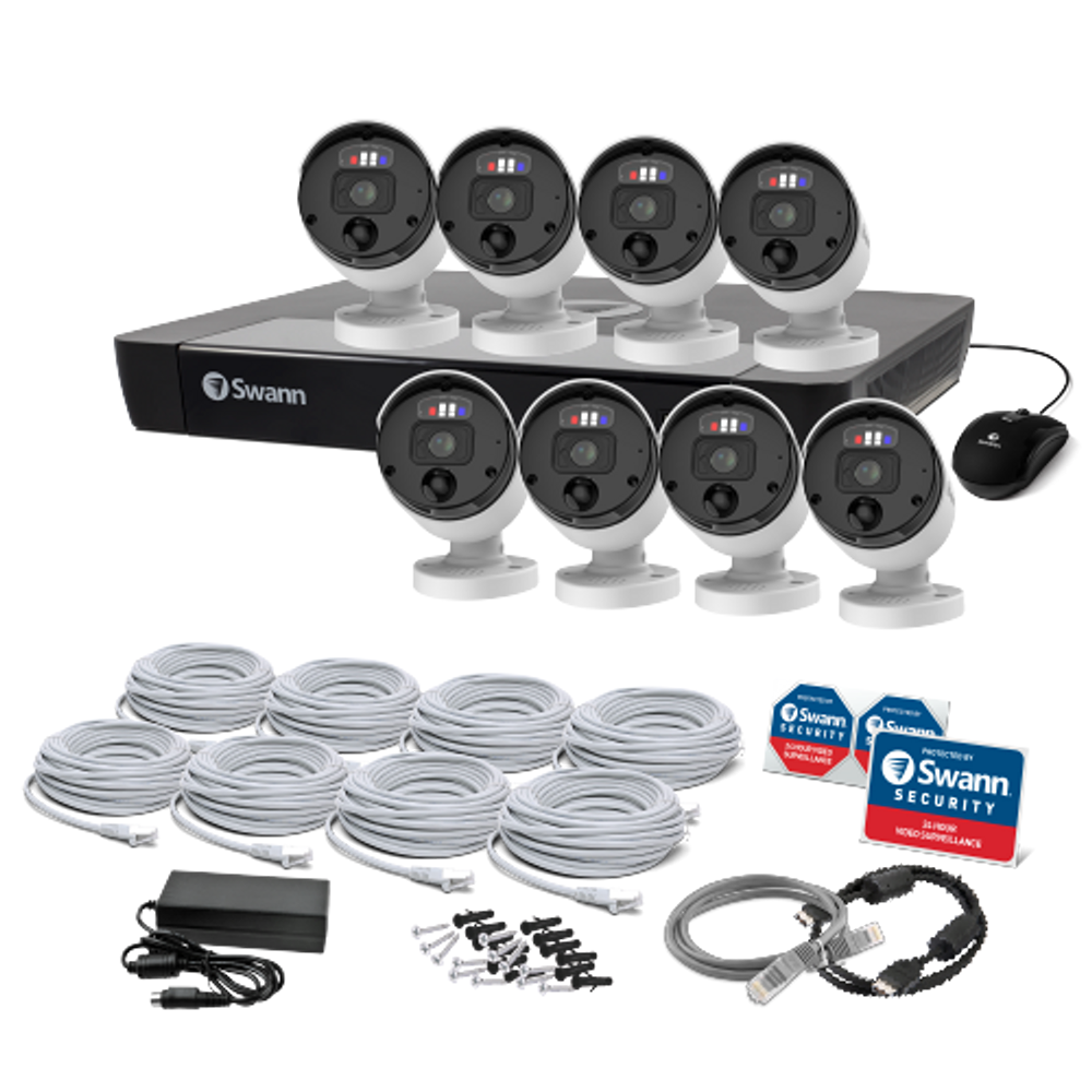 The Swann Pro 8 Camera 16 Channel 4K UHD NVR Security System (model SWNVK-1689808-US) offers comprehensive surveillance for your property. This system includes eight 4K Ultra HD cameras and a 16-channel Network Video Recorder (NVR) with a pre-installed 2TB hard drive, providing ample storage for your recordings.